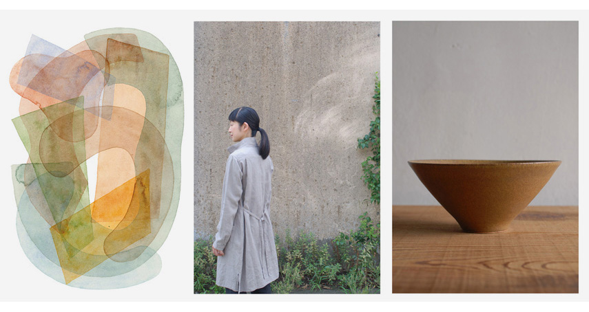 一柳さんの素晴らしい器、シックな秋色の平岩の服、色面の重なりを水彩画で描いた藤川。